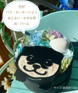 プリザーブドフラワーは寒色を使ってお水を表現。涼しげな仕上がりになりました。