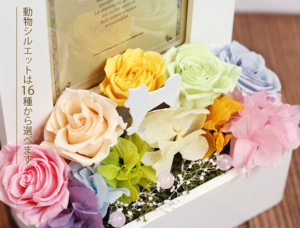 お花が大切なペットちゃんに代わるというわけではありませんが、いつも綺麗に咲いているプリザーブドフラワーは、みなさんに寄り添ってくれます。