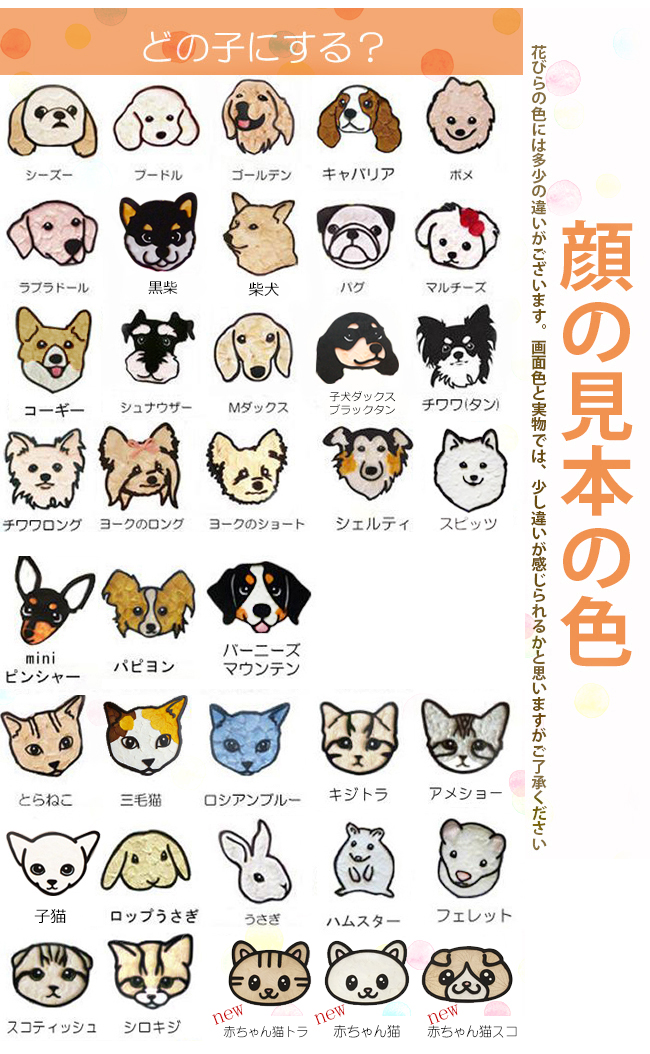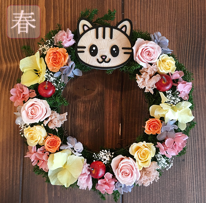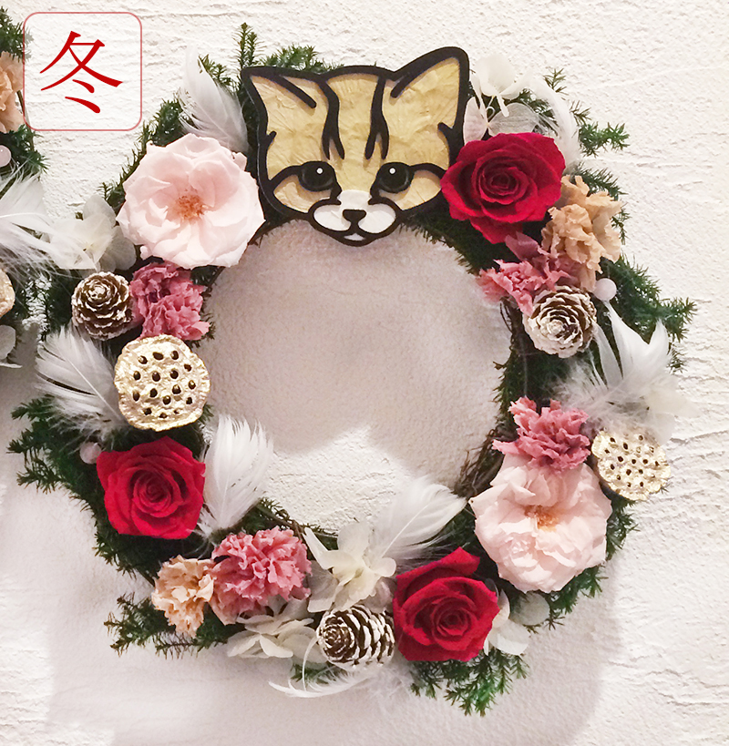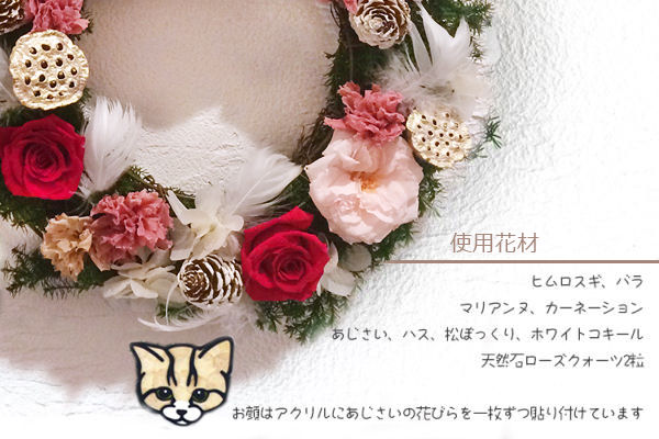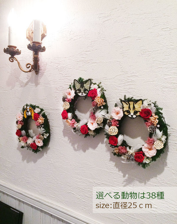 動物のお花屋さんオリジナルの、ペットの似顔絵入りリースです。春らしいピンクを基調にしたタイプと、クリスマスにぴったりな赤を基調にしたタイプをご用意いたしました。
