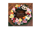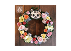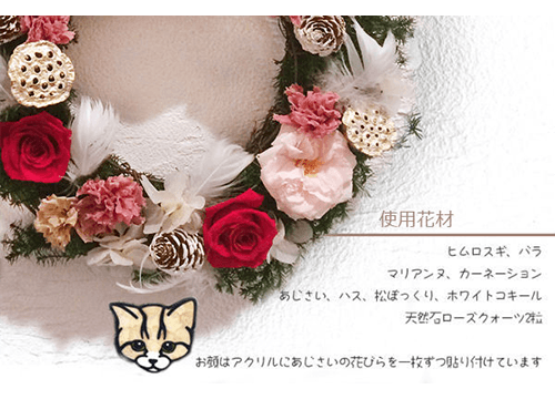 動物のお花屋さんオリジナルの、ペットの似顔絵入りリースです。春らしいピンクを基調にしたタイプと、クリスマスにぴったりな赤を基調にしたタイプをご用意いたしました。
