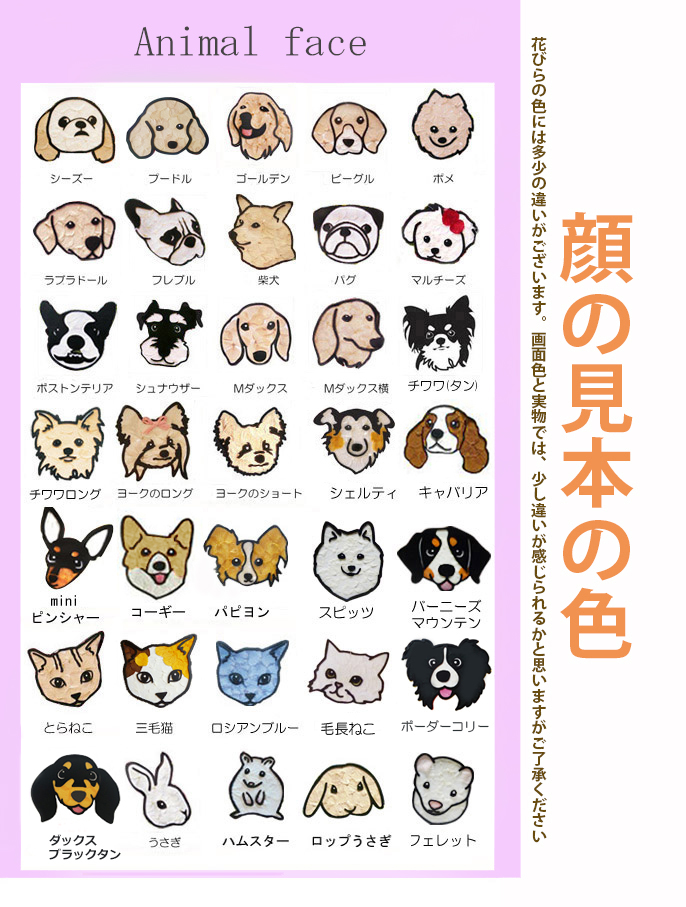 ビーグル、シュナウザー、シーズー、キャバリア、コーギー、バーニーズMt、ボーダーコリー、パピヨン、ピンシャー、シェルティ、三毛猫、チワワ(タン)、ダックスブラックタン