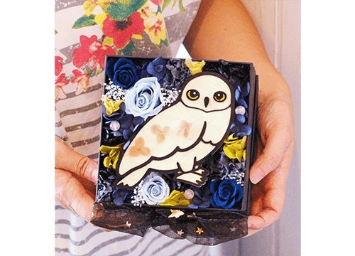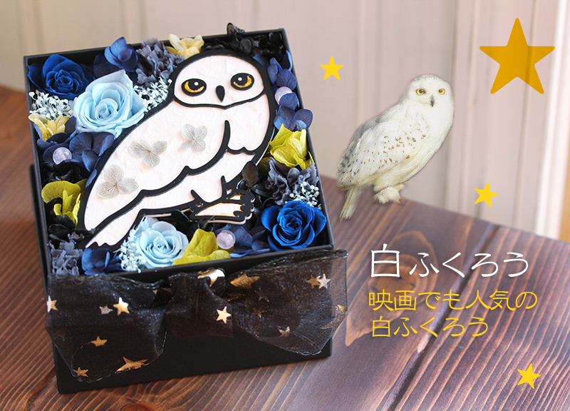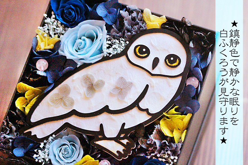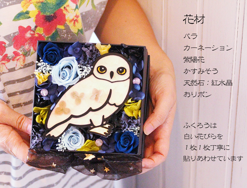 ふくろうは白い花びらを1枚1枚丁寧に張り合わせています。