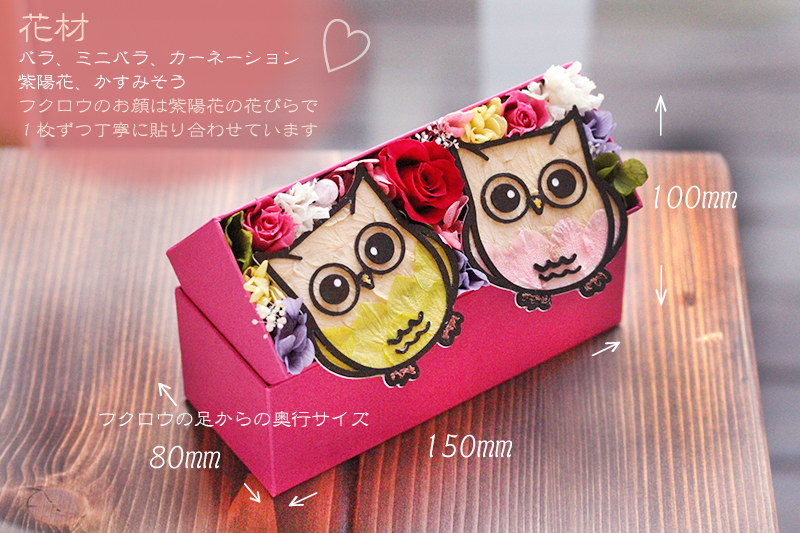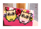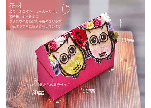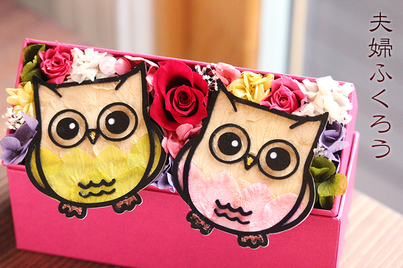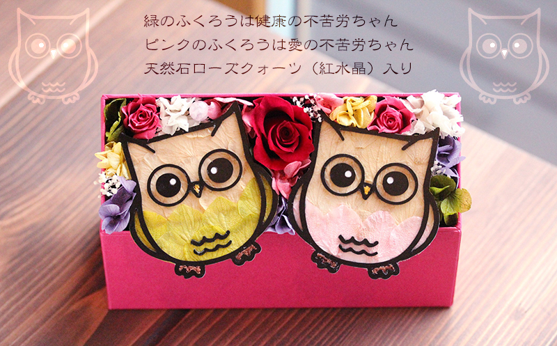 緑のふくろうは健康の不苦労ちゃん、ピンクのふくろうは愛の不苦労ちゃん。
