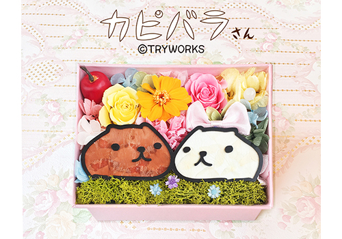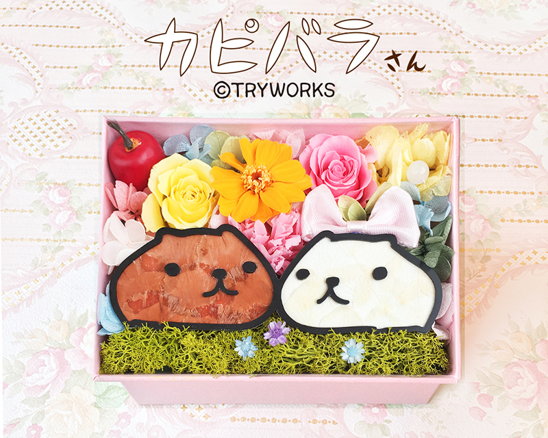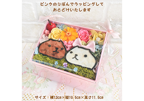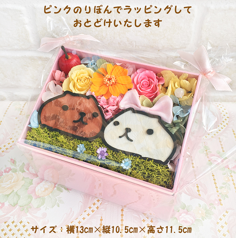 サイズ:横13cm×縦10.5cm×高さ11.5cm カラフルなプリザーブドフラワーが元気をくれるアレンジです。カピバラさんのキャラクター部分はプリザーブドフラワーの花びらを1枚1枚丁寧に貼り合わせて作られています。水やり不要で3年ほどキレイに飾って頂けます(直射日光や水気のある場所は避けて飾ってください)キャラクターの型枠は丈夫なアクリル製です。